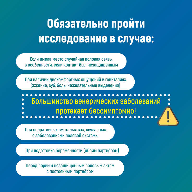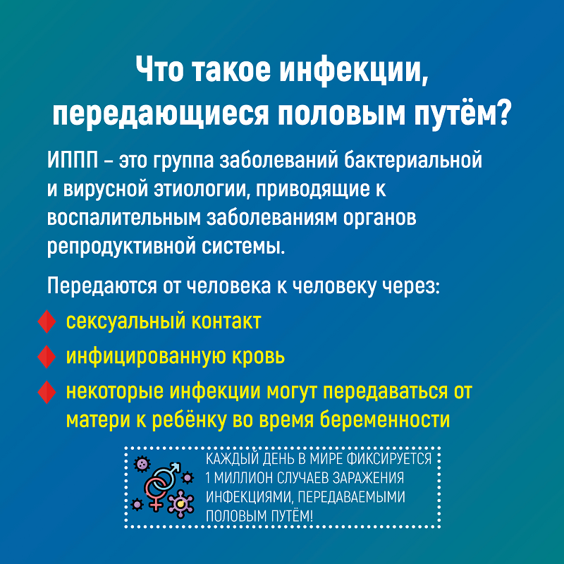 Неделя профилактики инфекций, передающихся половым путем- В 2023 г. в РФ было зарегистрировано 127 080 случаев инфекций, передаваемых половым путем (ИППП). Заболеваемость ИППП в 2023 г. составила 86,8 на 100 тыс. населения. После прироста заболеваемости ИППП в 2021 и 2022 гг. соответственно на 1,4 и 1,9% зарегистрировано снижение показателя в 2023 г. на 5%- К осложнениям ИППП относятся: хронические воспалительные и неопластические процессы органов репродуктивной системы человека, бесплодие. Так, хламидийная инфекция является инфекцией, способной приводить к воспалительным заболеваниям органов малого таза с последующим развитием трубного бесплодия и увеличения риска развития эктопической беременности. - Малосимптомное течение заболевания приводит к поздней диагностике инфекции и развитию осложнений со стороны репродуктивной системы человека. - Аногенитальные (венерические) бородавки являются клиническим проявлением инфицирования вирусом папилломы человека, наличие которого в свою очередь связывают с развитием рака шейки матки. Рак шейки матки за последние два десятка лет стал заболеванием молодых женщин, что, отрицательно сказывается на репродуктивном потенциале. - Пути первичной профилактики, направленной на дальнейшее снижение заболеваемости инфекциями, передаваемыми половым путем, определяются информированием населения, в первую очередь молодежи, организацией доступной и удобной для пациентов работы центров для профилактики и лечения ИППП, проведением регулярных скринингов и профилактических обследований на ИППП для своевременного выявления малосимптомных и бессимптомных форм заболеваний, пропагандой здорового образа жизни, ответственного отношения к своему здоровью. - Важным компонентом профилактики заражения ИППП является информирование о безопасном сексуальном поведении. - Для своевременной диагностики необходимо периодическое, в том числе профилактическое, обследование на ИППП, что позволит снизить распространение инфекций и риск развития осложнений и нарушений репродуктивной функции. - Мерами профилактики распространения ИППП является обязательное обследование и лечение половых партнеров, а также своевременно начатая терапия. - Обязательным является контрольное обследование после лечения в установленные сроки и отсутствие половых контактов во время лечения.